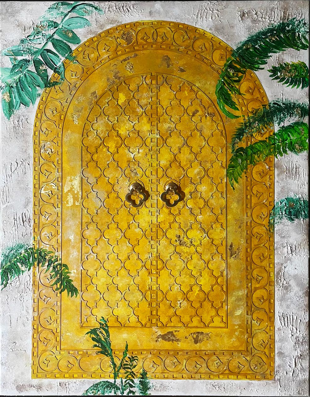 Design Bespoke ArtStep into a moment of stillness and sacred connection with “The Door of Divine Presence”, an original mixed-media artwork that evokes the timeless symbolism of gateways in Islamic spirituality. This radiant piece features a richly textured, ornate door - reminiscent of ancient Islamic architecture, set within a hand-textured neutral wall, framed by gently cascading green foliage.