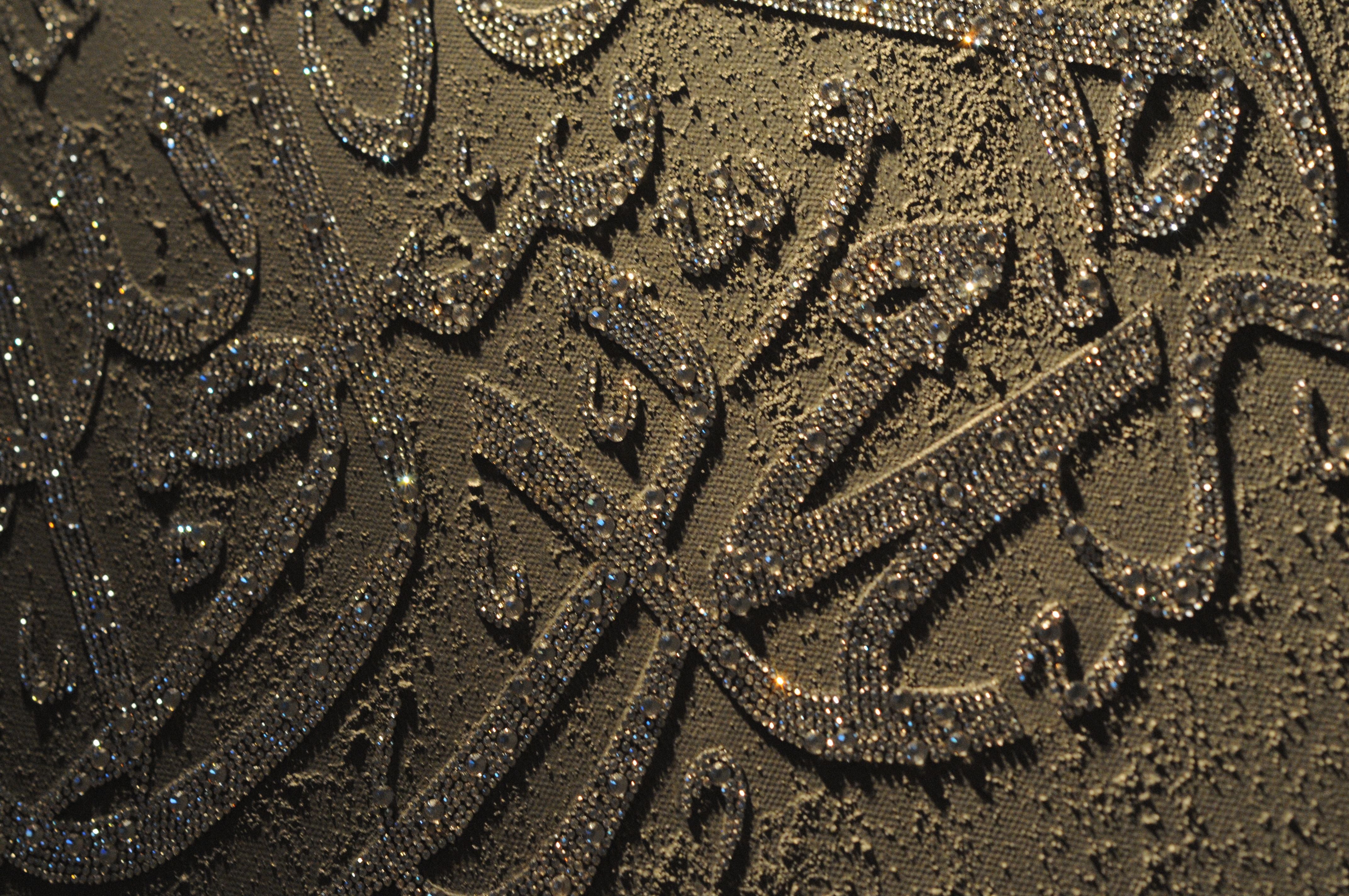 'Truth' is one of the earlier pieces in the collection but one that is very dear to the artist’s heart. The grey background signifies all that is in our universe, both seen and unseen. The calligraphy, shaped to depict our Earth, is crystallized using clear Swarovski’s to denote the feelings of clarity and spirituality that enter your life when you understand and accept the meaning of these words.