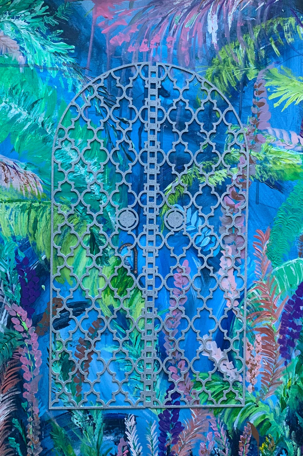 A colourful botanical bliss, with abstract flowers and mystery. The artwork features glamorous shades of dusty pinks and indulgent peaches, blues and greens. Boasting a delightful backing of gold-leaf, the abstract artwork emanates a soft, soothing sensation with petals carefully crafted and devotedly designed. There is a sense of happiness, bliss and hope.