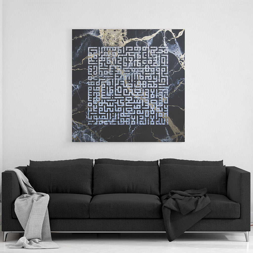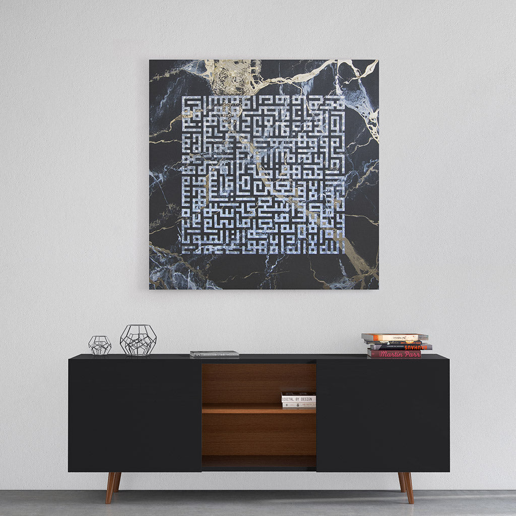 To depict its true splendour, the artist chose a universal Kufic script given its geometric square / rectangular design which gives off a strong character. The original artwork contained a hand painted marble background and with crushed silver leaf calligraphy.