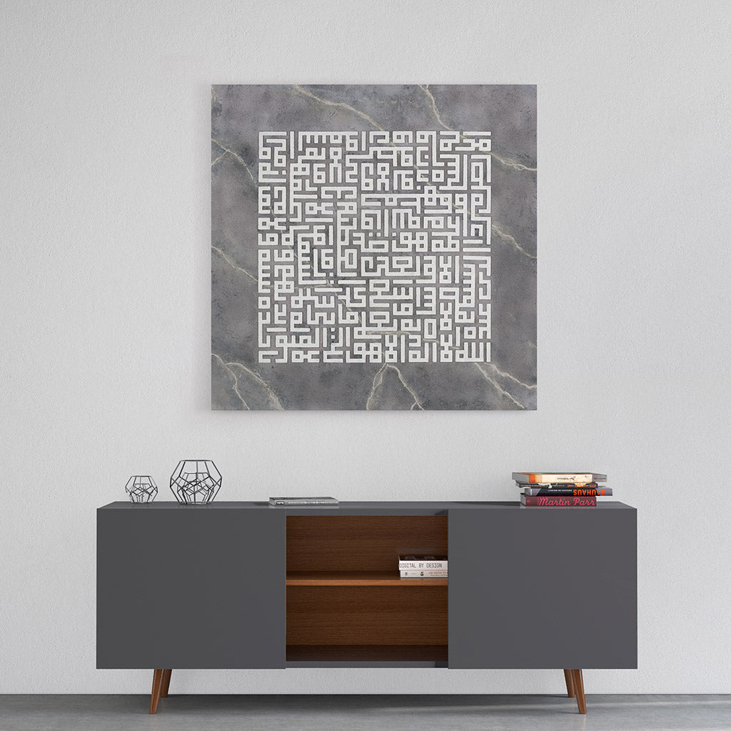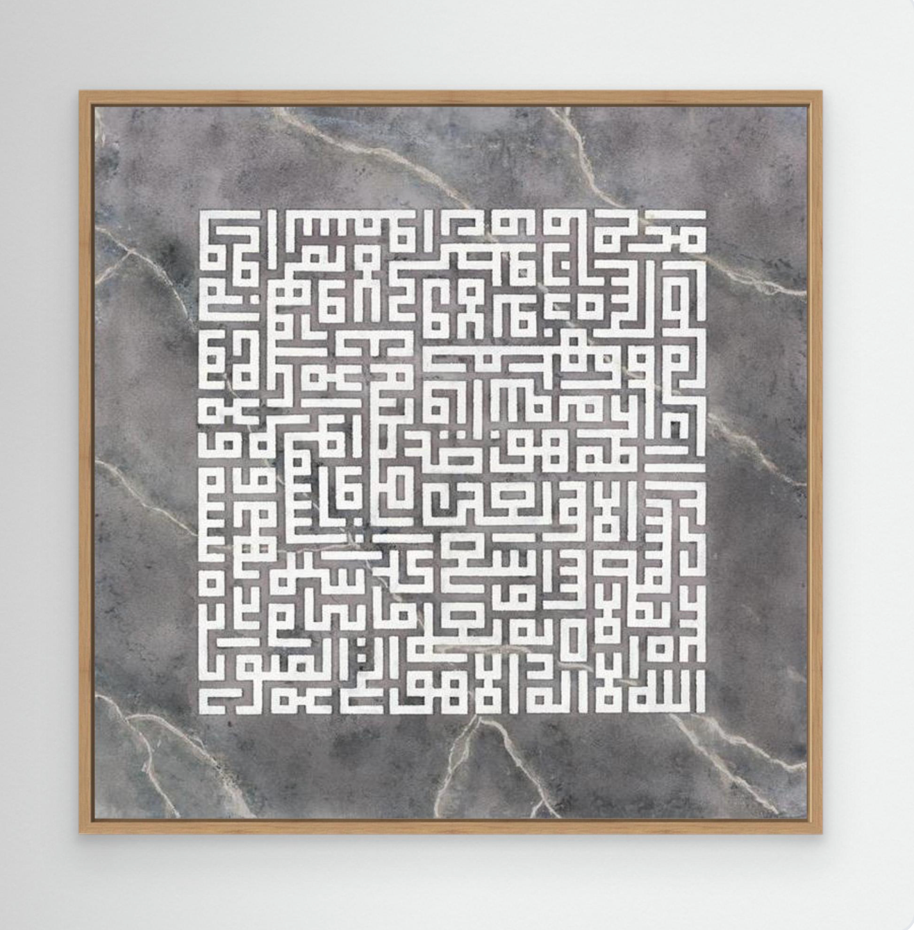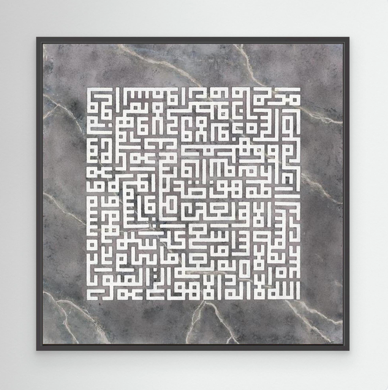 To depict its true splendour, the artist chose a universal Kufic script given its geometric square / rectangular design which gives off a strong character. The original artwork contained a concrete and marble background with stone white covering the calligraph