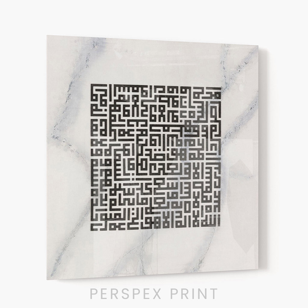 Kufic Arabic has been used to illustrate the power, divinity and infinite strength of this powerful revelation by using a strong square design. It has a marble hand painted background and dark grey stone effect calligraphy.