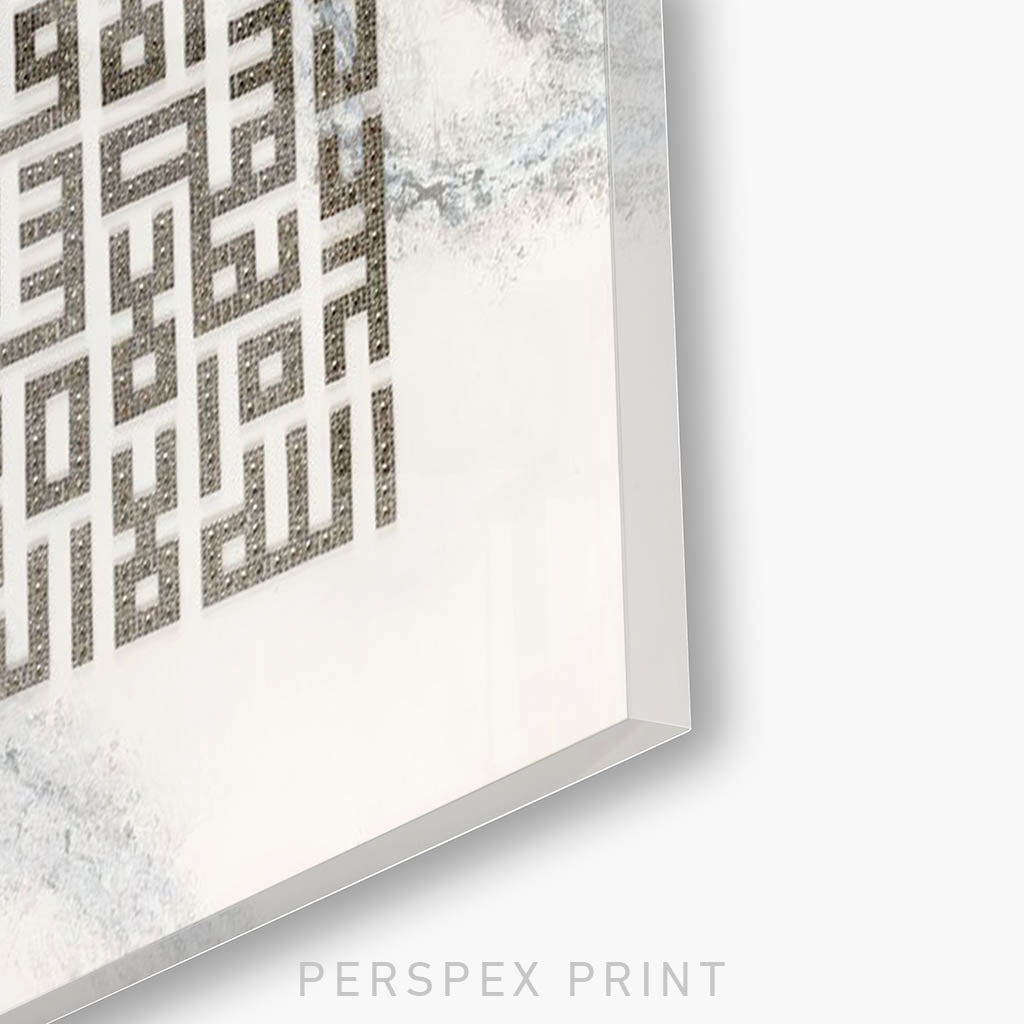 To depict its true splendour, the artist chose a universal Kufic script given its geometric square / rectangular design which gives off a strong character. The original artwork contained a marble background with Swarovski crystals covering the calligraphy.