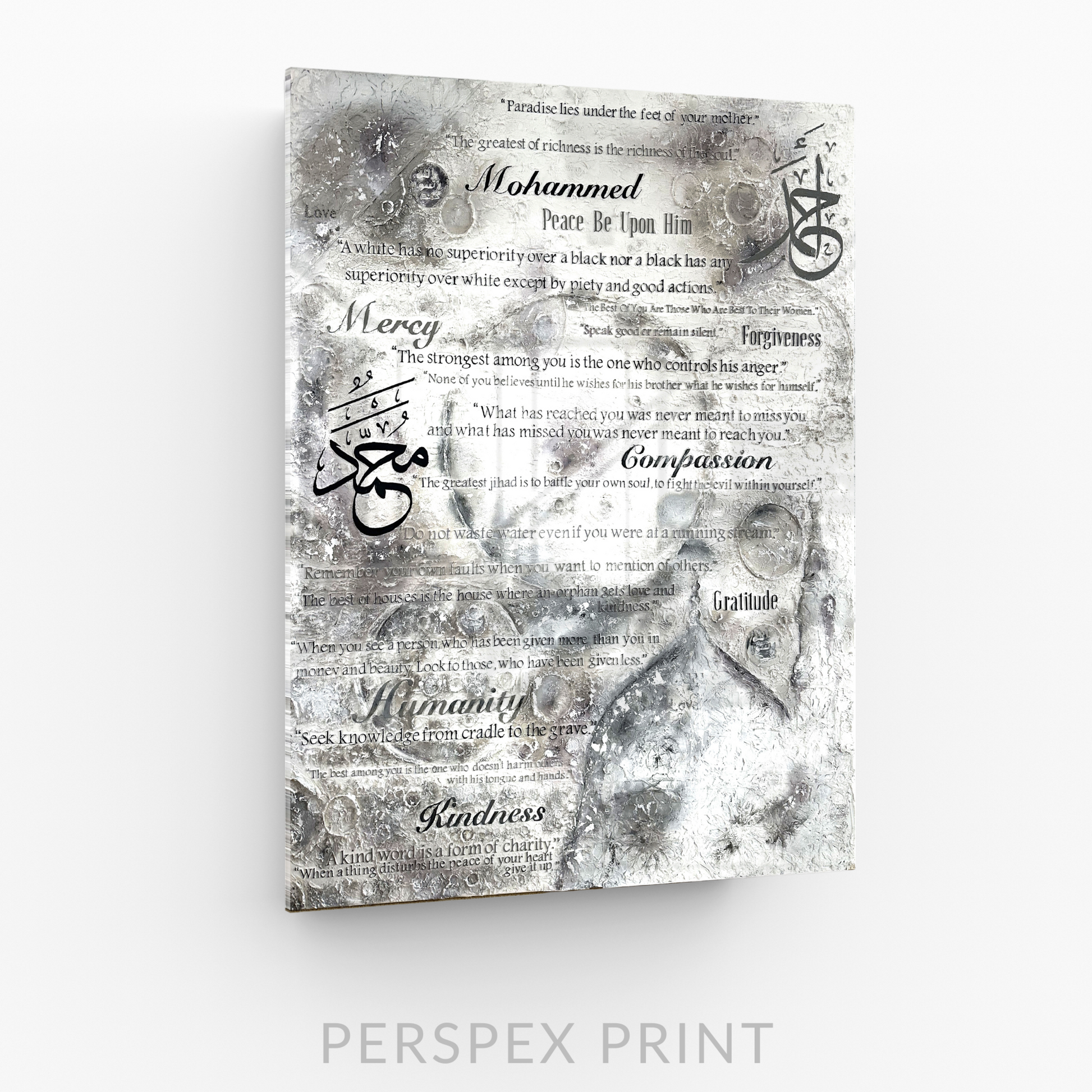 This artwork highlights some of his prophetic traditions (hadith) principles which are timeless and can provide us comfort and guidance. This is a must have for all households and will serve as a reminder of the nature of Prophet daily. Concepts such as leadership, racism, humanity, equality, environment, truthfulness, forgiveness, gratitude, mercy, kindness and compassion are all concepts we can learn from.