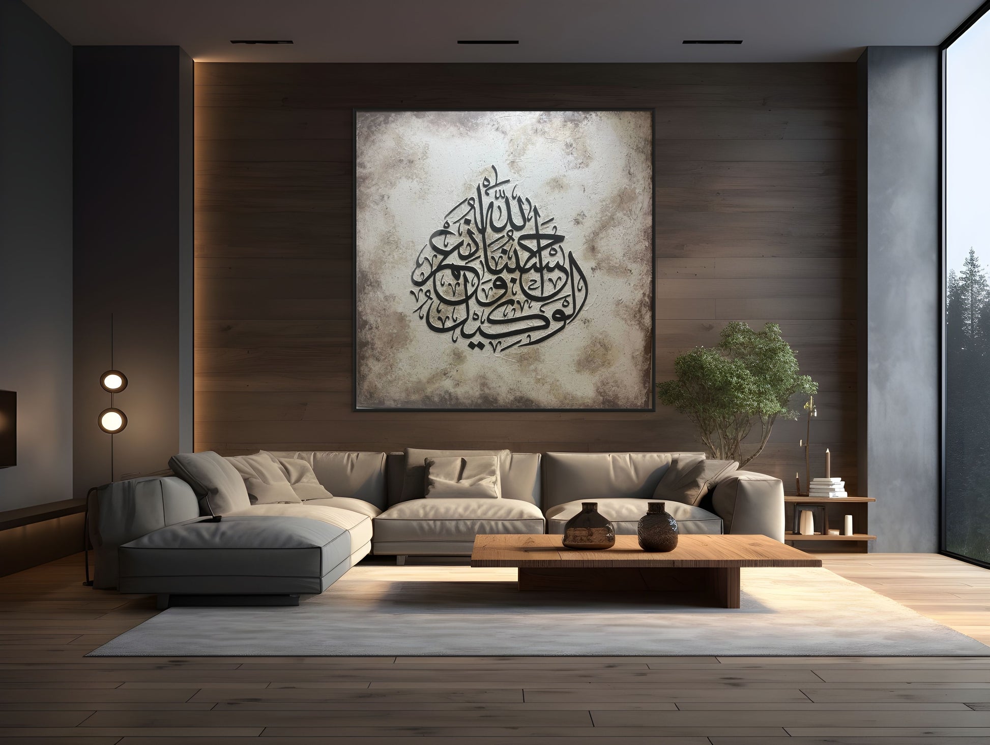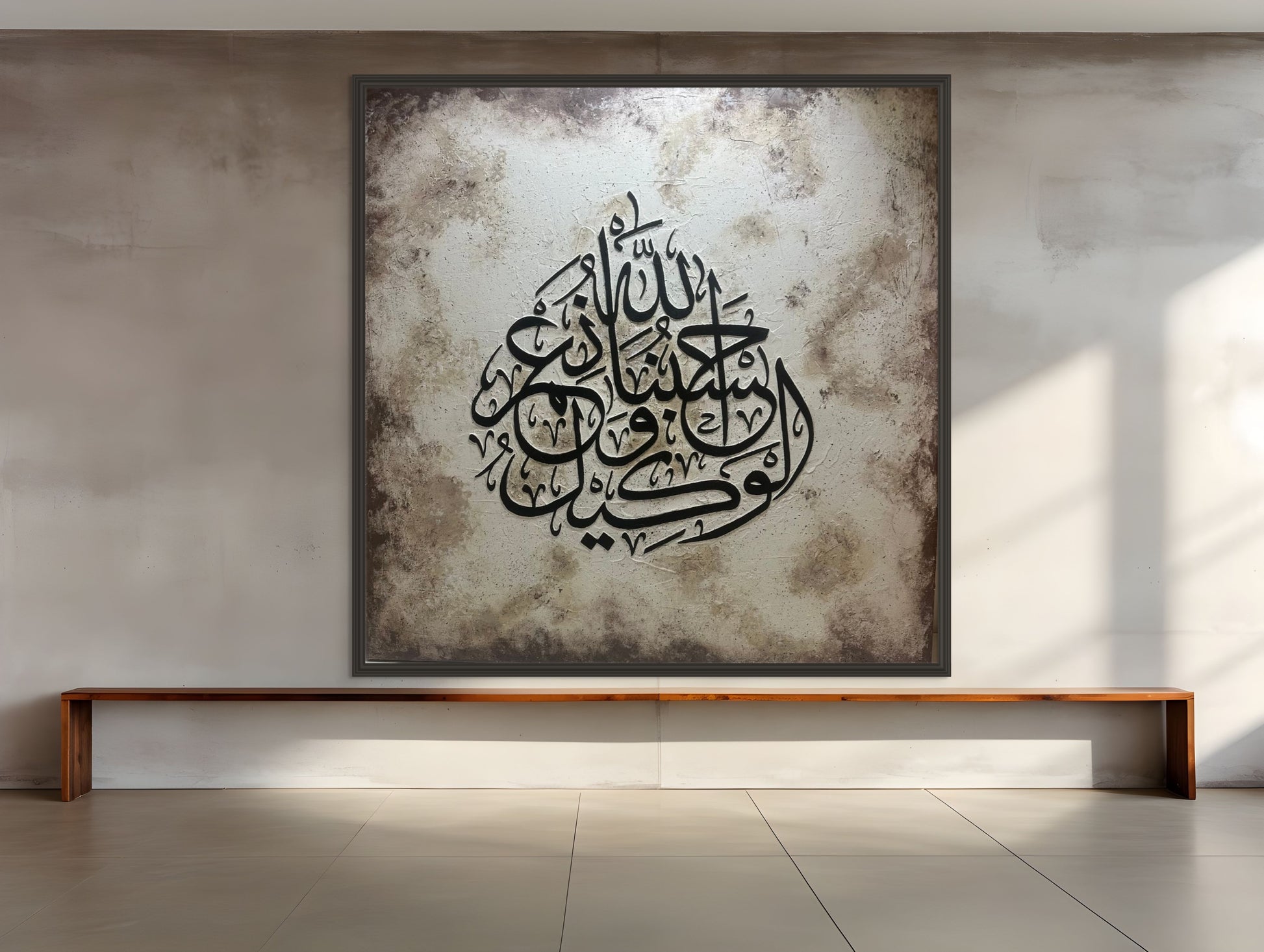 Blending contemporary Islamic calligraphy with the soul of classical spirituality, Sacred Trust pairs earthy textures with modern minimalism to create a timeless message of resilience and divine nearness.