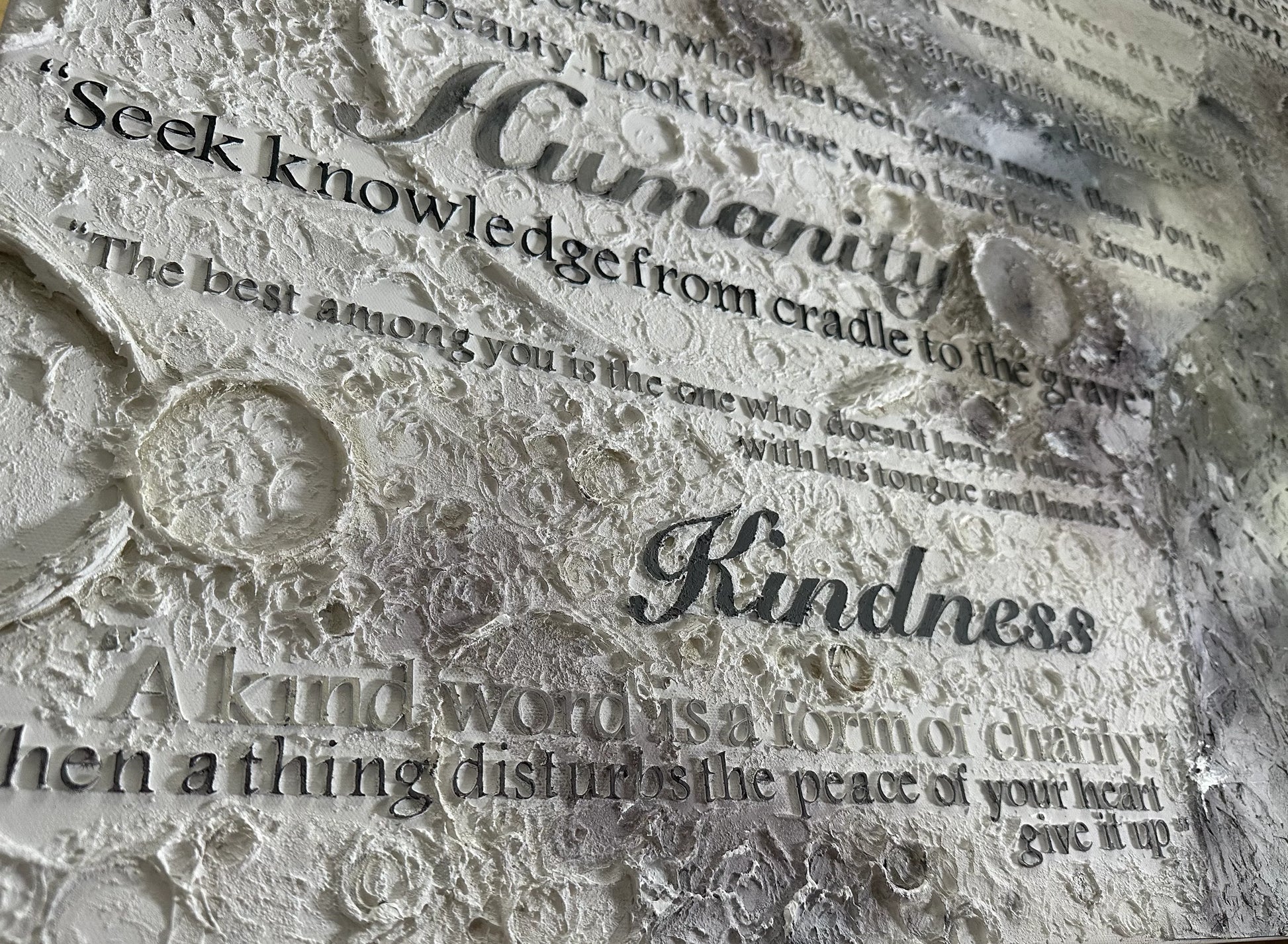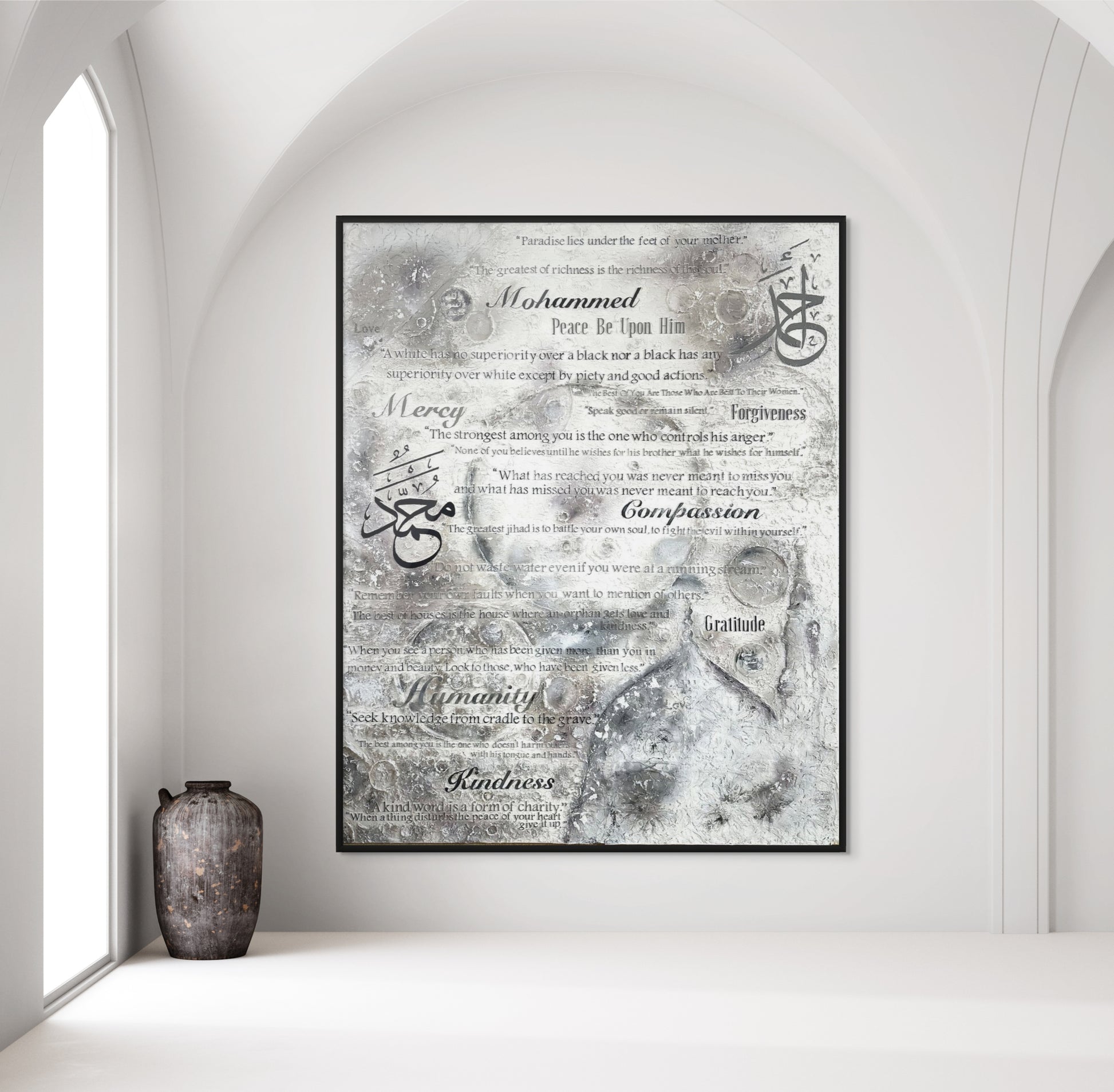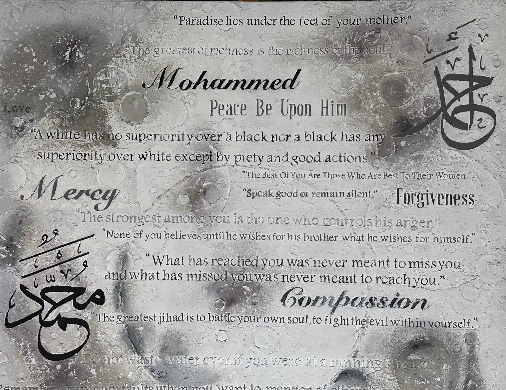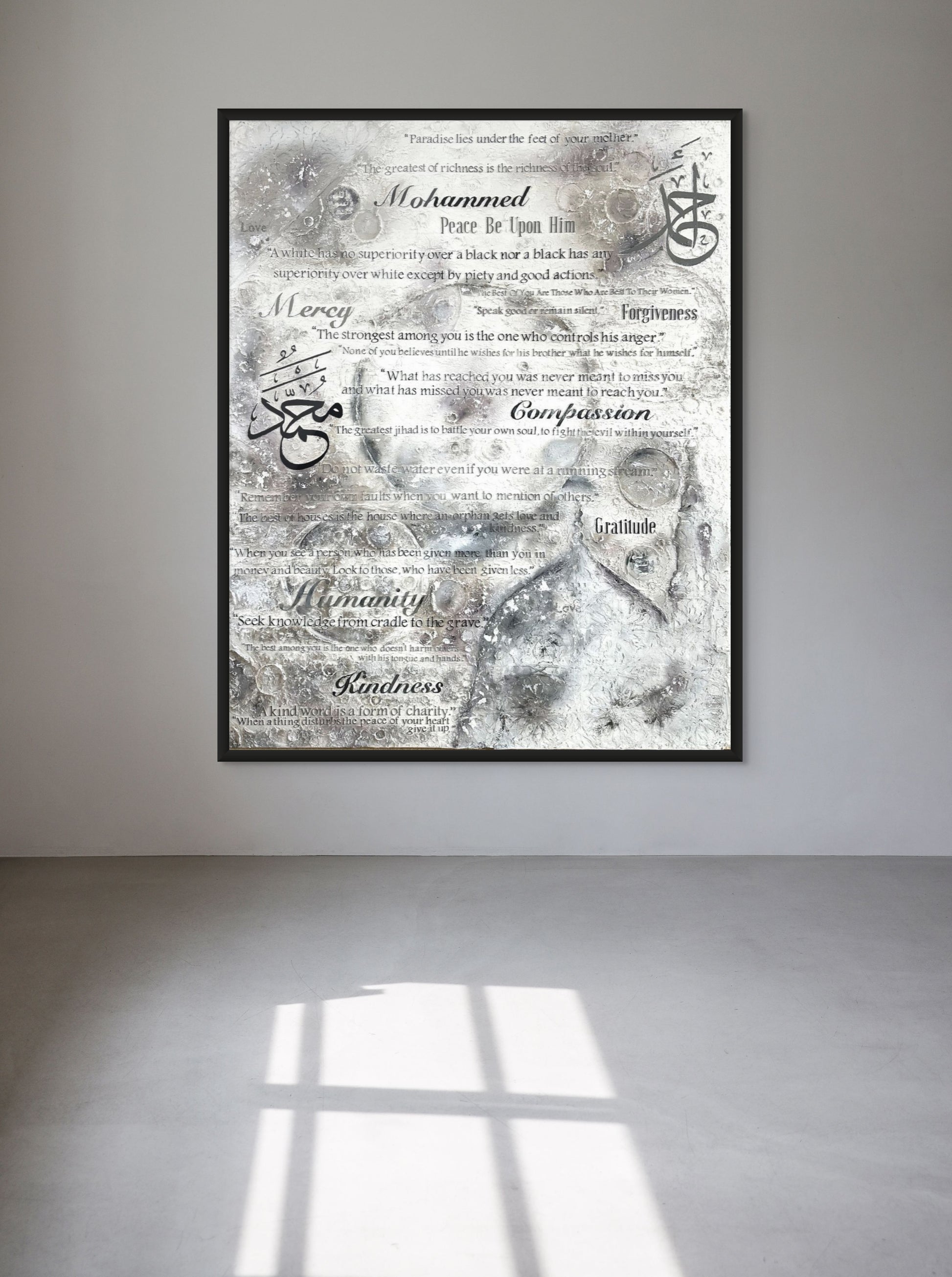 This artwork honors Prophet Muhammad (SAW), the “walking Quran” and a shining light of mercy and guidance. His timeless wisdom - on kindness, compassion, truthfulness, equality, and gratitude—is captured in every detail of this piece.