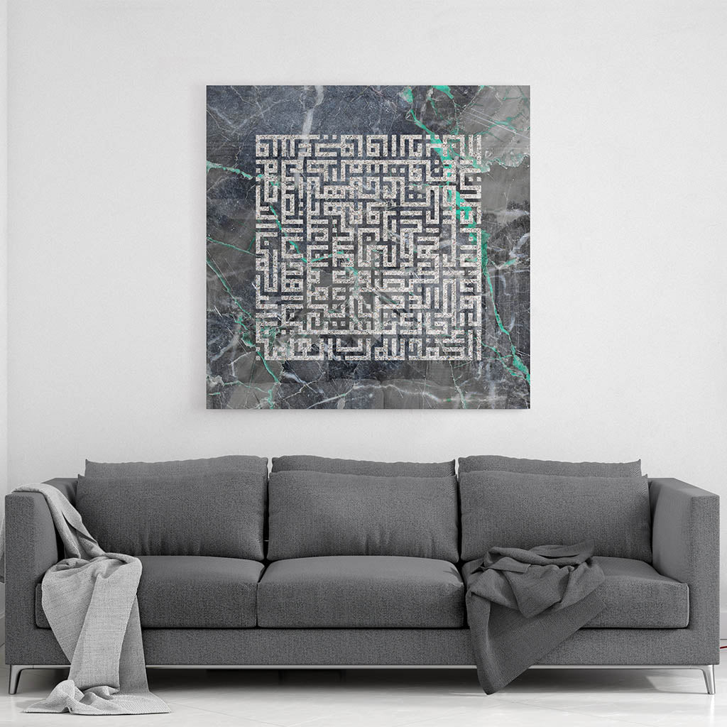Modern design combined with the marble background and gold veins are used to signify that even when something is broken once pieced together can be even more beautiful then it originally was. This has been inspired by the Japanese method of “Kintsugi”. The Swarovski crystals and pearls have been scattered on different words to signify that’s just as God has hidden treasures all over this world, so do the power of his words.